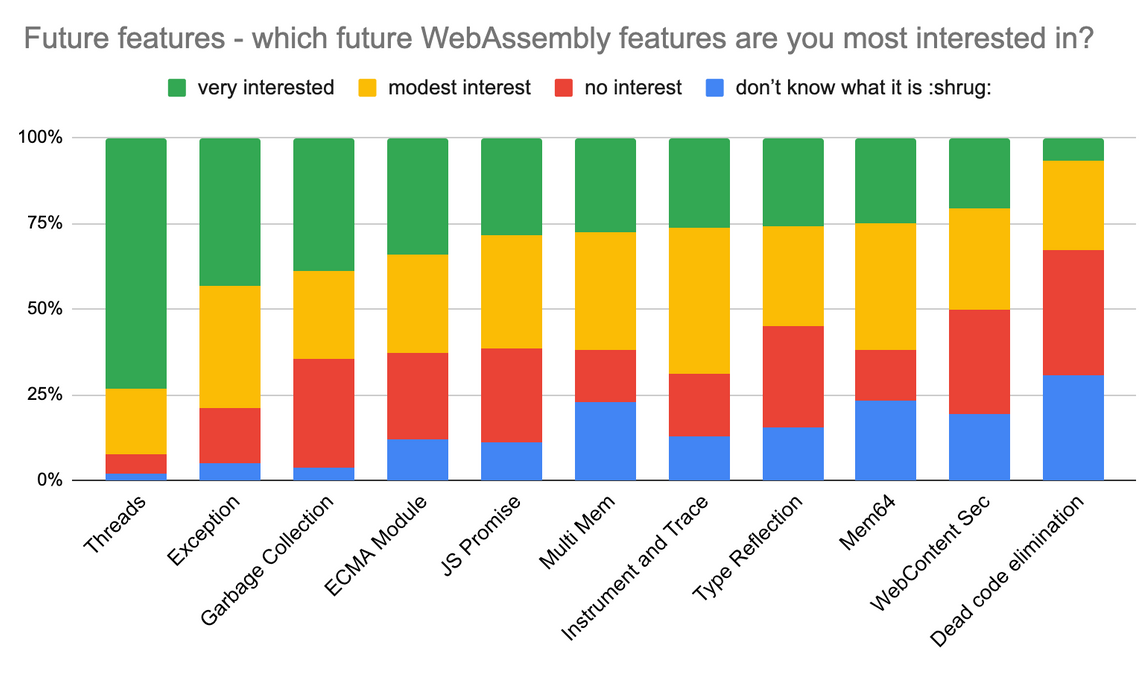 WebAssembly follows a public proposal process governed by W3C. This survey included a subset of the more mature proposals at phase 2 (specification available), and phase 3 (implementation), asking which people are most interested in.